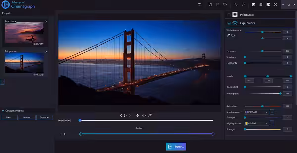 - Video enhancements for perfect cinemagraphs: The success of every video production largely hinges on the source material. That’s why Ashampoo Cinemagraph allows you to quickly adjust exposure and color settings. Fine-tune color saturation, adjust shadows, and optimize light conditions in a flash!