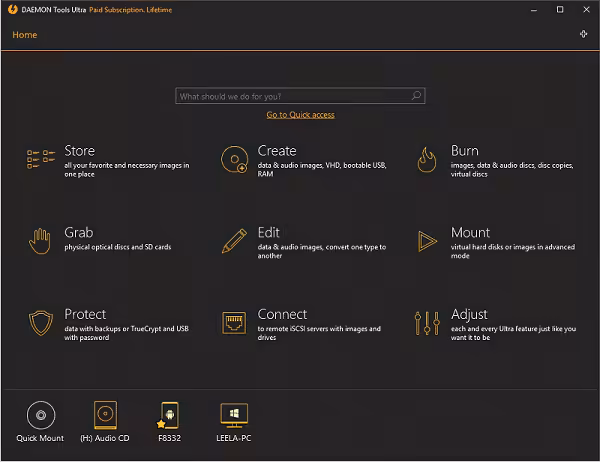 DAEMON Tools Ultra is the most powerful, ultimate, and advanced imaging software we’ve ever created. Get the immense list of possibilities to work with virtual drives, create bootable USB sticks for operating system recovery, use RAM disks to speed up your PC, and evaluate the unique iSCSI Initiator that allows connecting to USB devices.