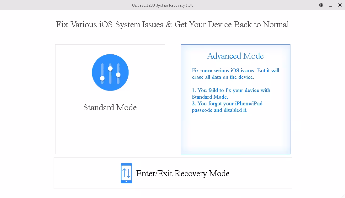 Ondesoft iOS System Recovery you can fix most iOS/iPadOS/tvOS problems by yourself without any data loss. The main issue you worry about when you fix iOS devices by yourself may be data loss. Don’t worry. Ondesoft iOS System Recovery’s Standard Mode fixes various iOS issues securely without erasing your data.