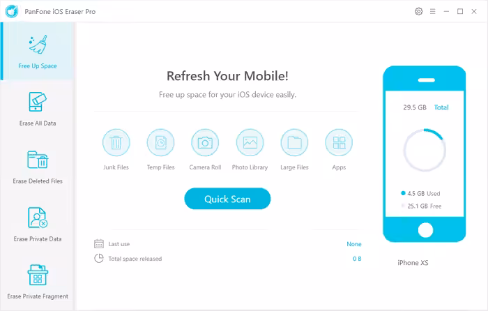 PanFone iOS Eraser Pro. Before you sell, donate, or give away your iOS device, ensure that all your personal files on the device have been completely erased, making them unrecoverable. With this iOS data eraser, you can permanently erase 29 types of all existing data and deleted files, including SMS, contacts, call history, photos & video, notes, bookmarks, calendars, reminders, etc. from iPhone/iPad/iPod with no chance of recovery.
